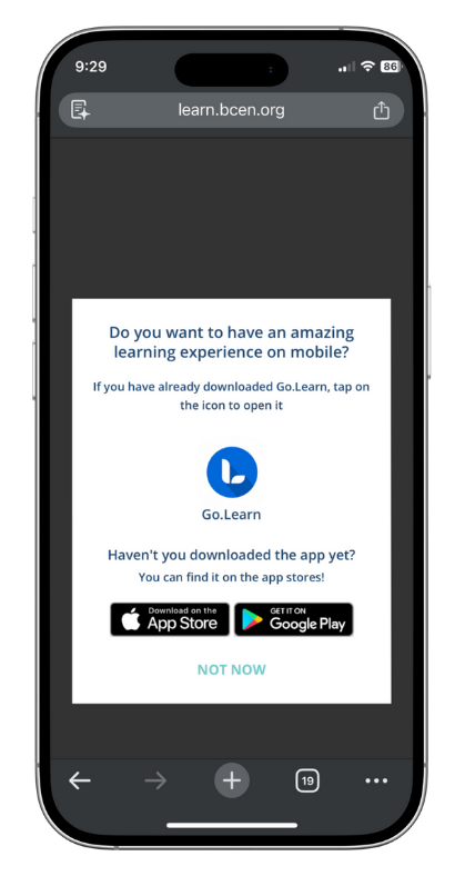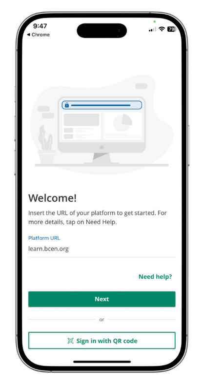 Upon opening the Go.Learn app, you’ll be prompted to enter the Platform URL. Enter learn.bcen.org and hit the Next button.
