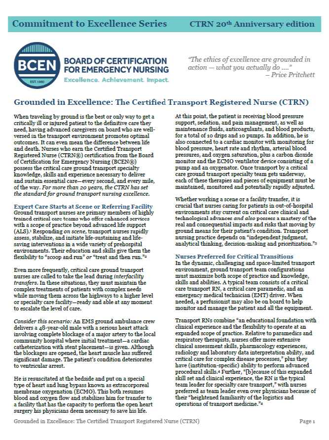 As part of our ongoing commitment to provide information and resources to nurses pursuing certification and employers seeking to support certification for their nurses, BCEN has published a series of free white papers for emergency nurses, ED leaders, nurse educators, and hospital and health system administrators. Accompanying PowerPoint presentations are also available for free download.
