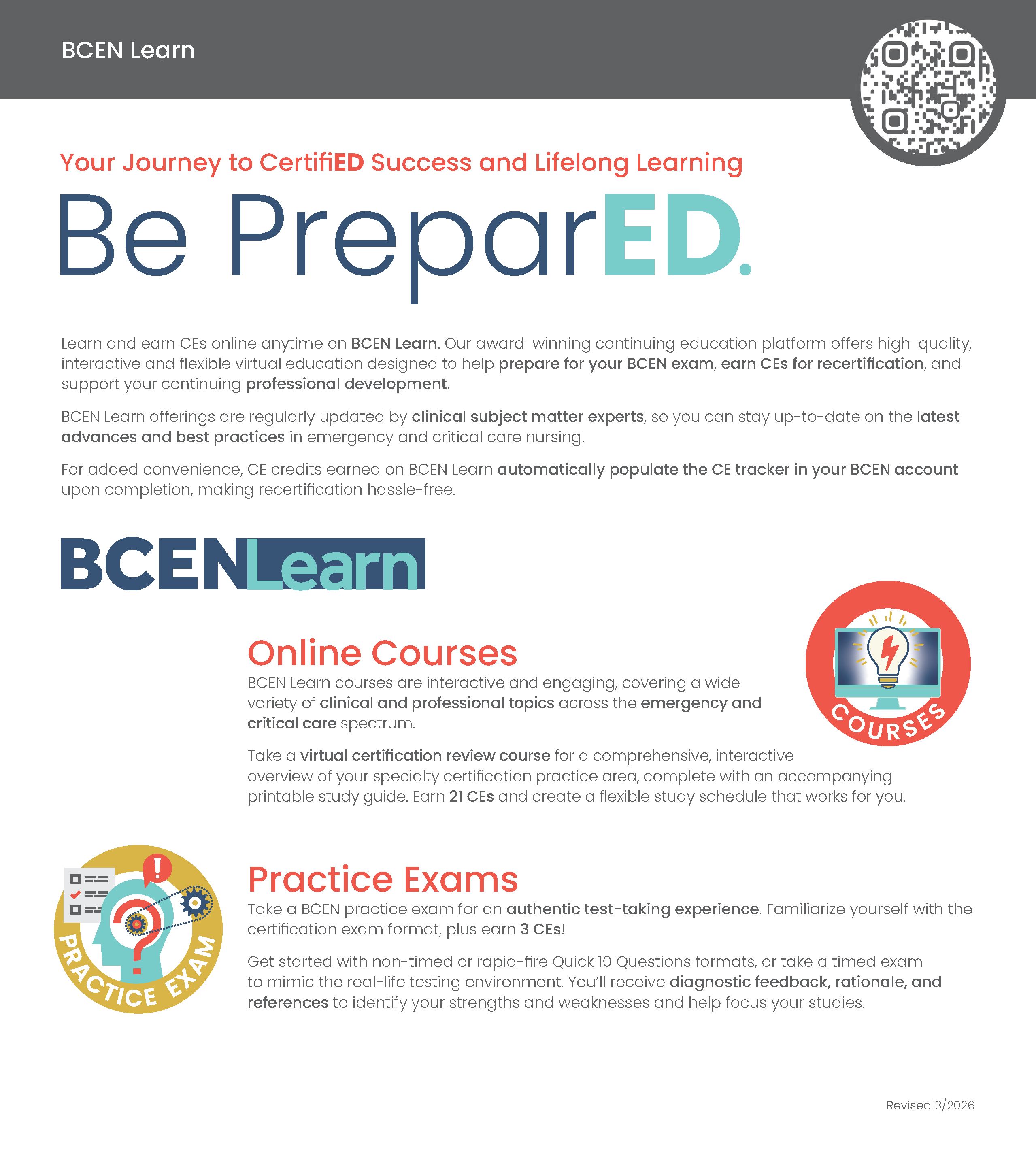 The same authentic test-taking experience you expect from BCEN now has even more value. When you purchase and take one of our practice exams, you’ll be eligible to earn three CEs.
