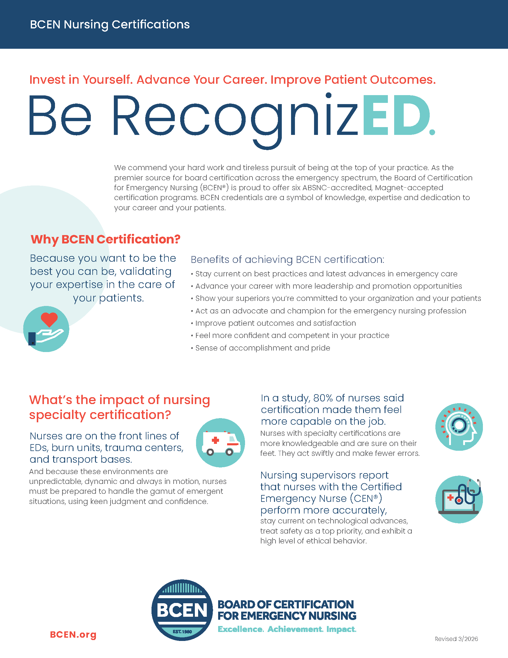 Need quick, easily accessible information on the products and services offered by BCEN? Look no further! These materials put all the facts at your fingertips. Learn more about the certification process, how to maintain your certification and the benefits and value of pursuing board certification from BCEN — the benchmark in emergency nursing certification. Simply click to download. These one-sheets are a free asset provided to you by BCEN.